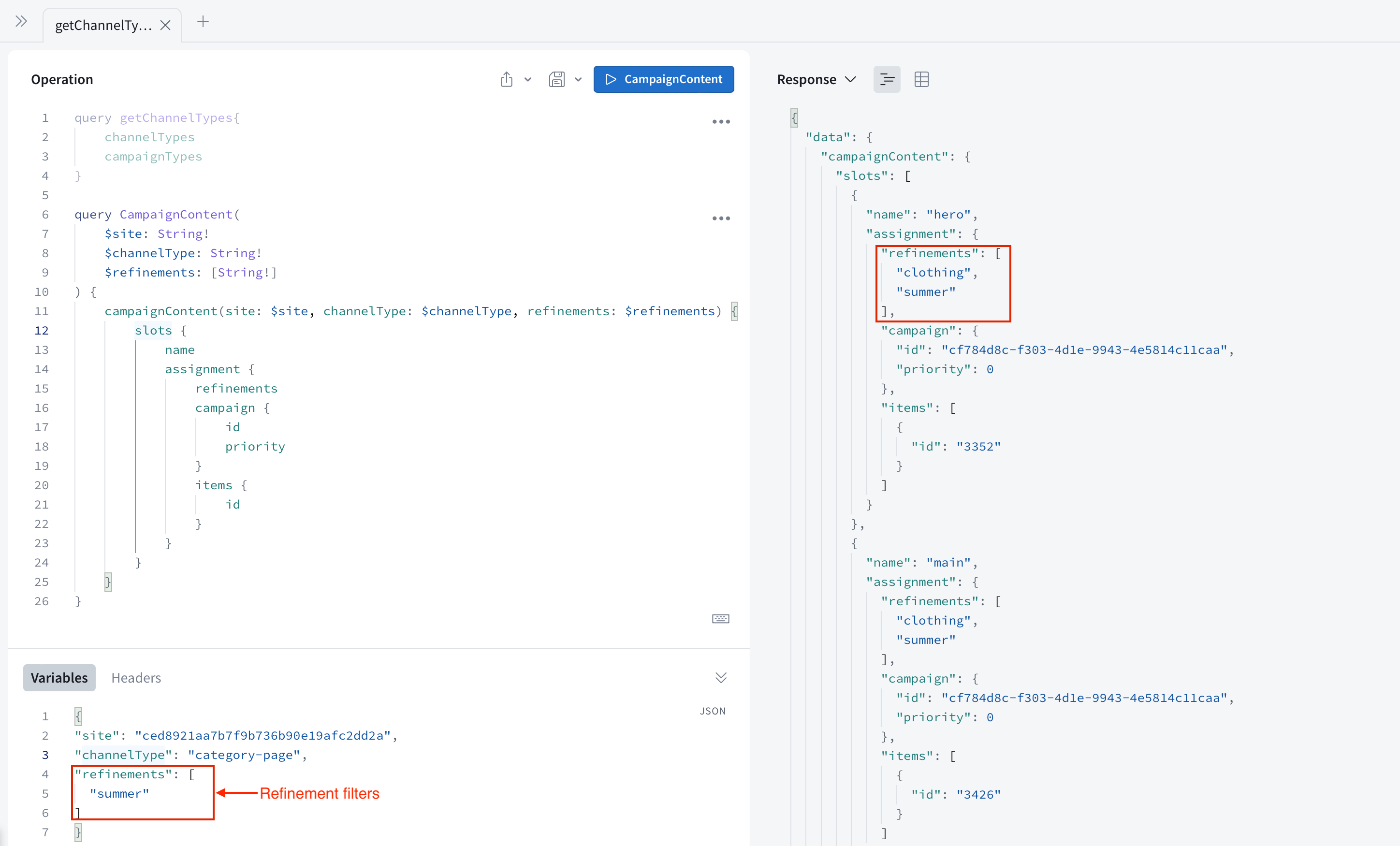With the CoreMedia Campaigns Delivery API the frontend developer gets one endpoint to retrieve content IDs that are managed via the Campaign App for the queried site-id, channel types and refinements. These IDs then can be used to request more detailed information about single content from the Headless Server.