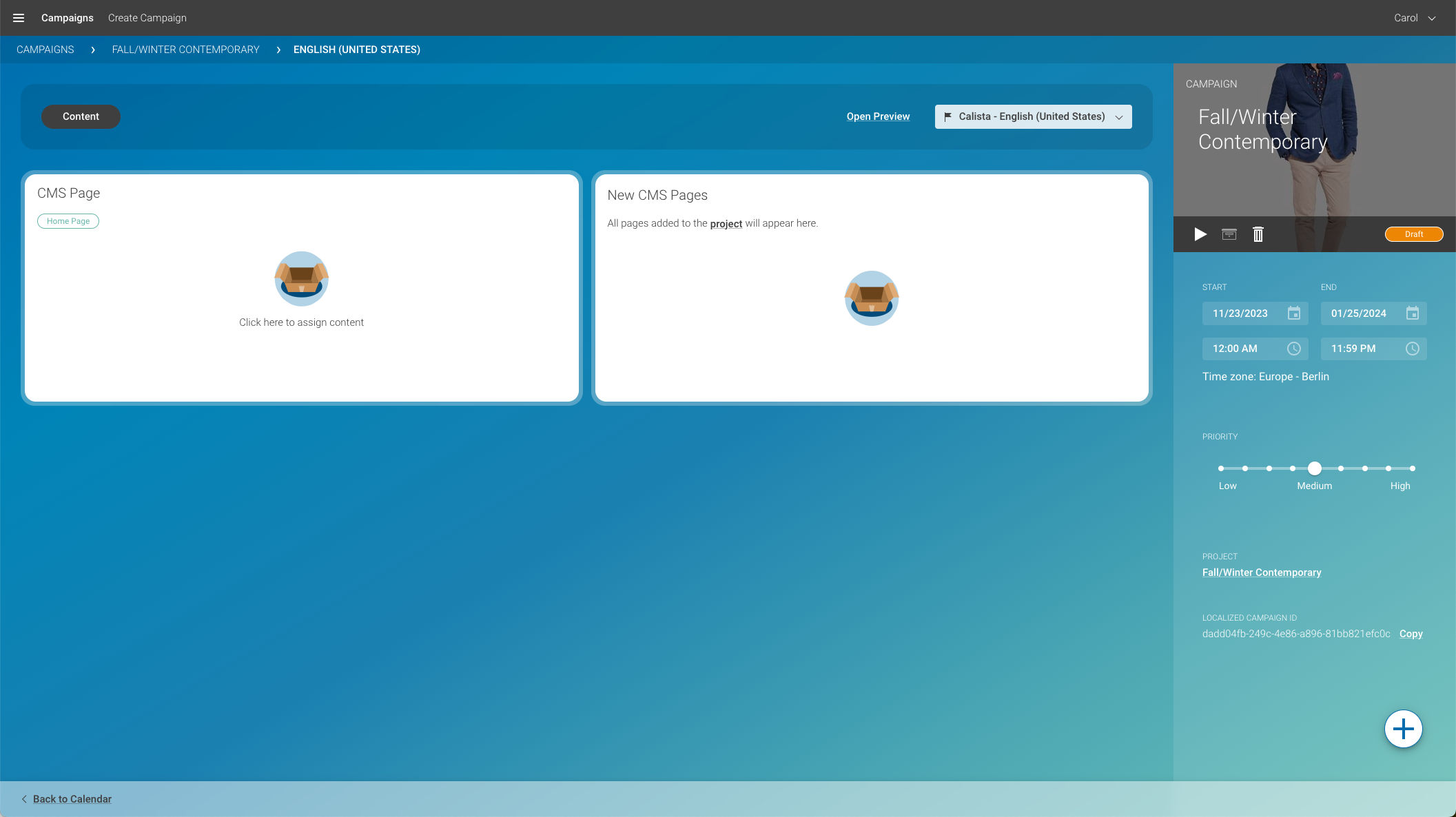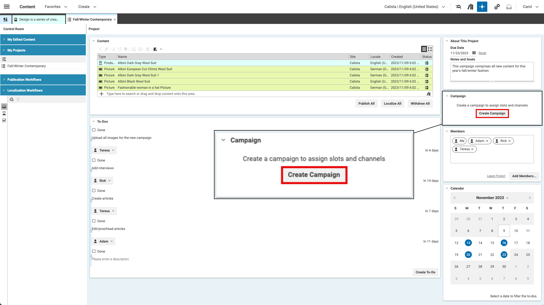 Before you can start to create a Campaign, you have to collect the content you want to use into a project as described in Using Projects.