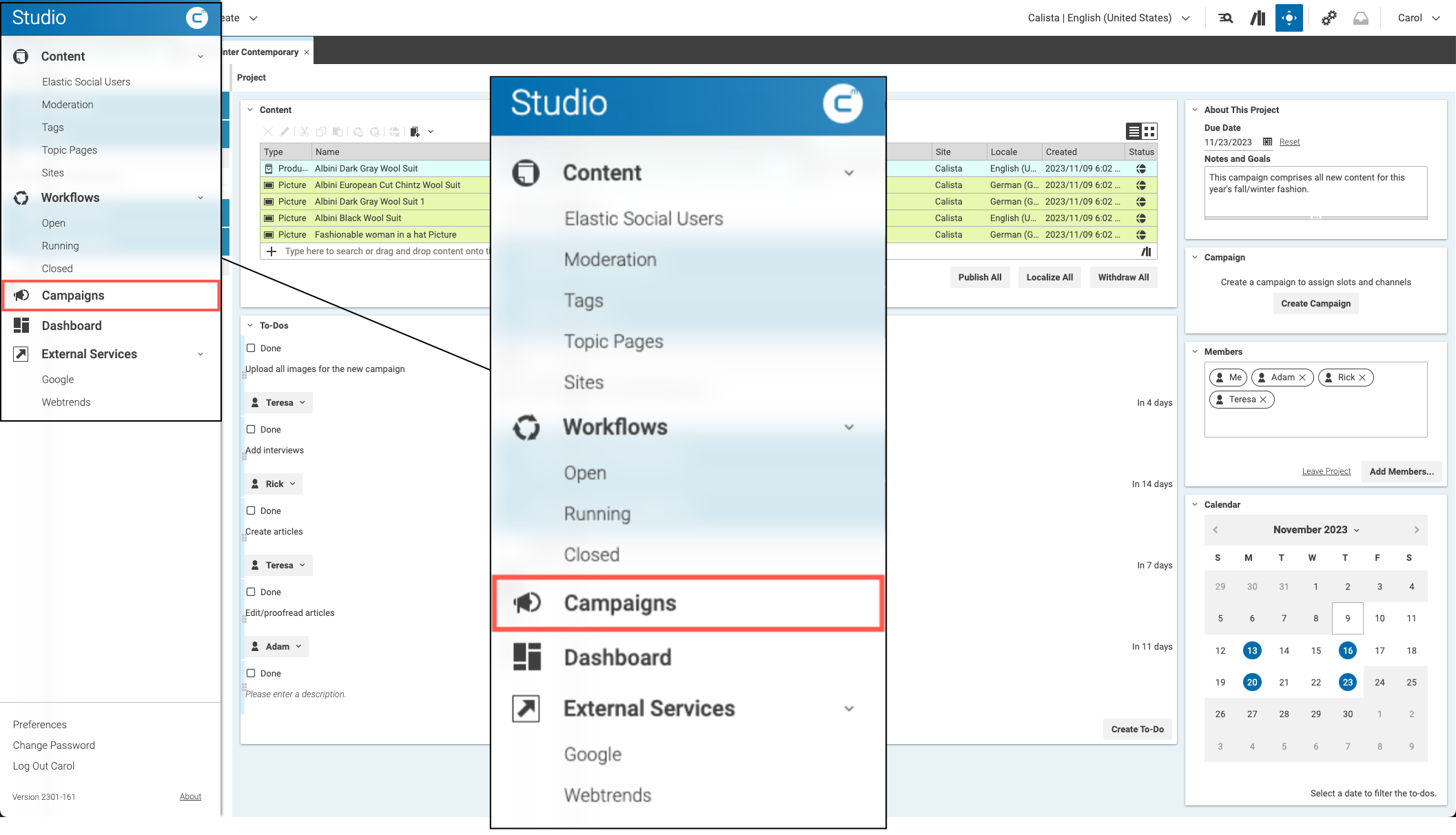 Click the Campaigns menu item in the main menu of CoreMedia Studio: