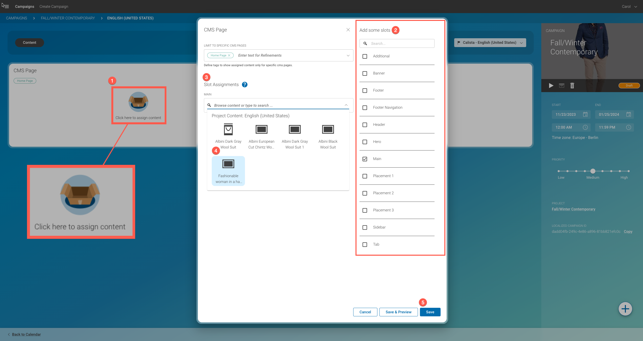 Click into the respective slot field. You will see a list of all content that you have added to the project.