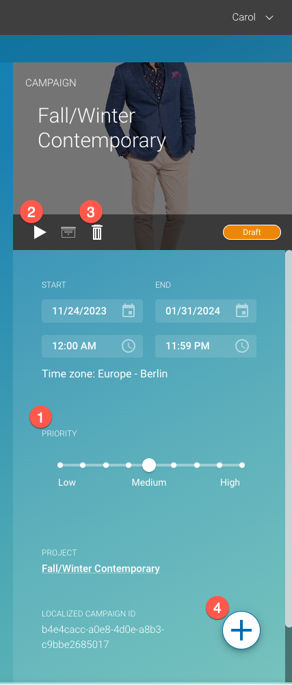 When you have more than one campaign running at the same time, they might share the same channels or slots. In this case, you can prioritize campaigns. Content of campaigns with higher prioritization will be favored in comparison to lower prioritized campaigns depending on the actual delivery implementation.