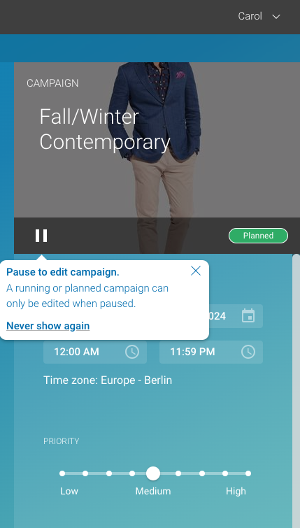 | In this example, you have chosen a start date in the future. Therefore, once you click on Start, the campaign does not immediately go live. By pausing it, you will still be able to edit it. Once the date in the future is reached, the status of your campaign will switch from Planned to Running. |