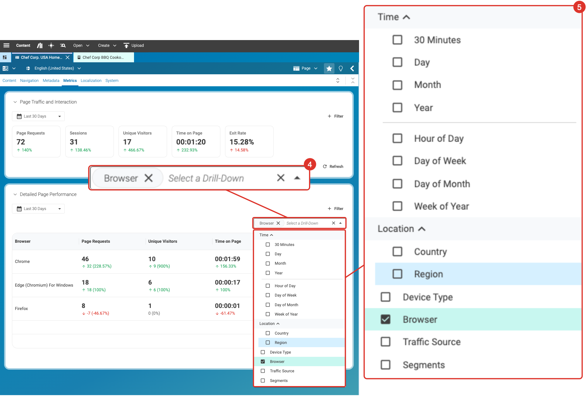 When first accessing the Metrics tab, you will see two boxes. Page Traffic and Interaction (2) is a summary of Detailed PagePerformance (3). The difference between the two boxes is that the view at the top (1) provides you with quick info at a glance. The bottom box (3) allows you to further differentiate the data by selecting your approach to group the data (as described in the next step).