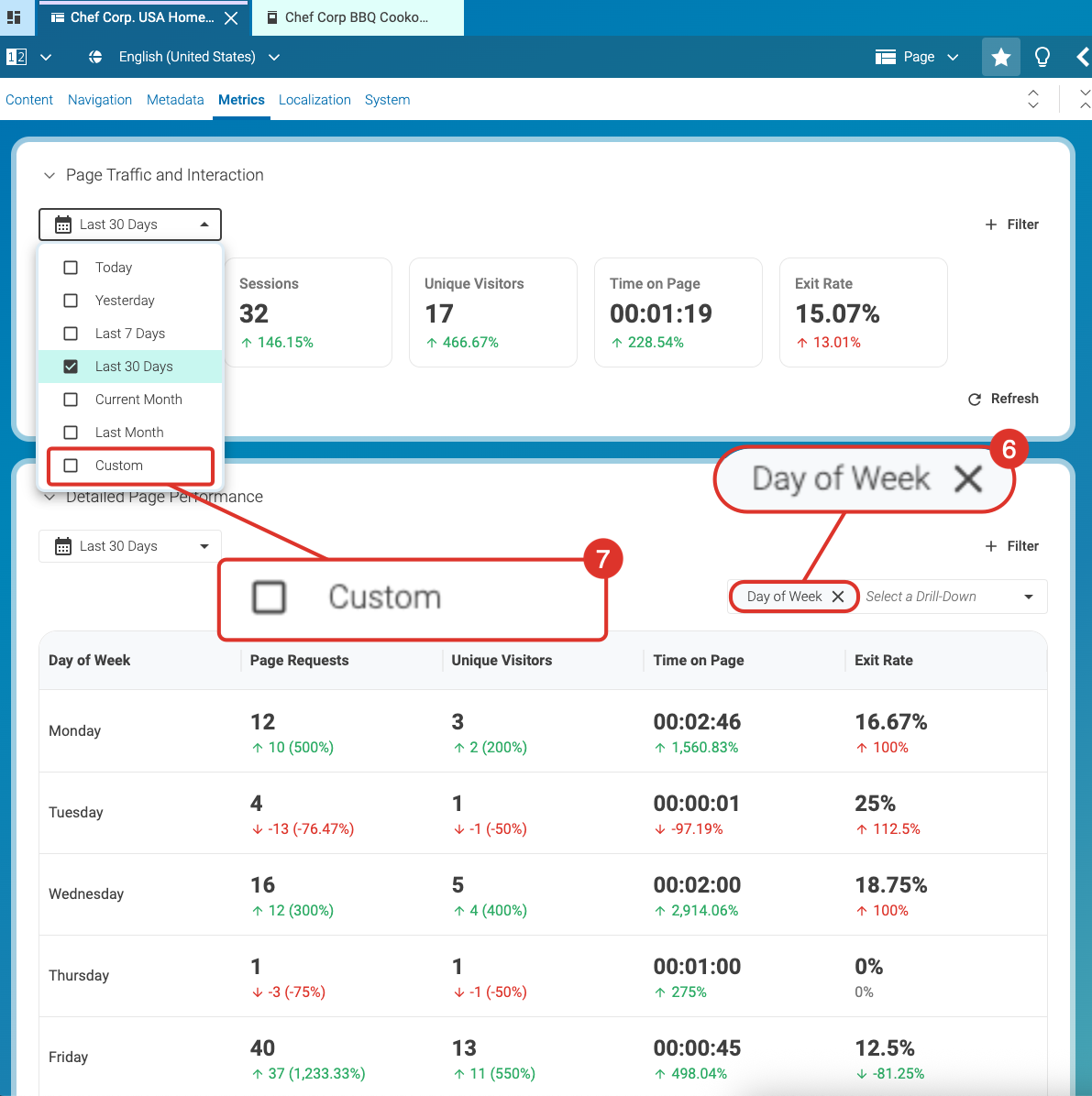 In the bottom box (Detailed Page Performance), select the Drill-Down option Day of Week (6).