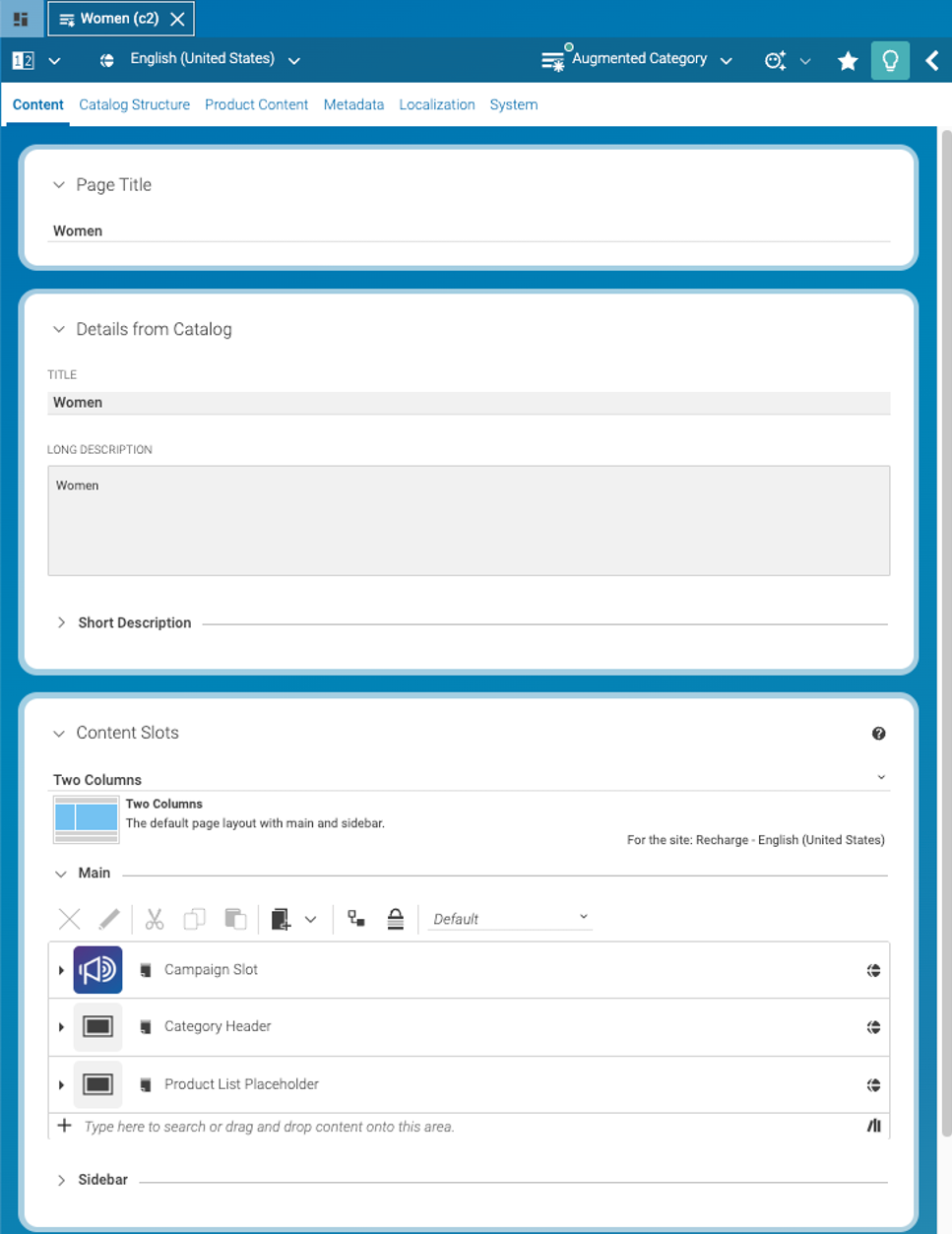 The Augmented Category form is designed to enrich category and product pages with content. By default, the Content tab includes a variety of data fields and cards to support this purpose.