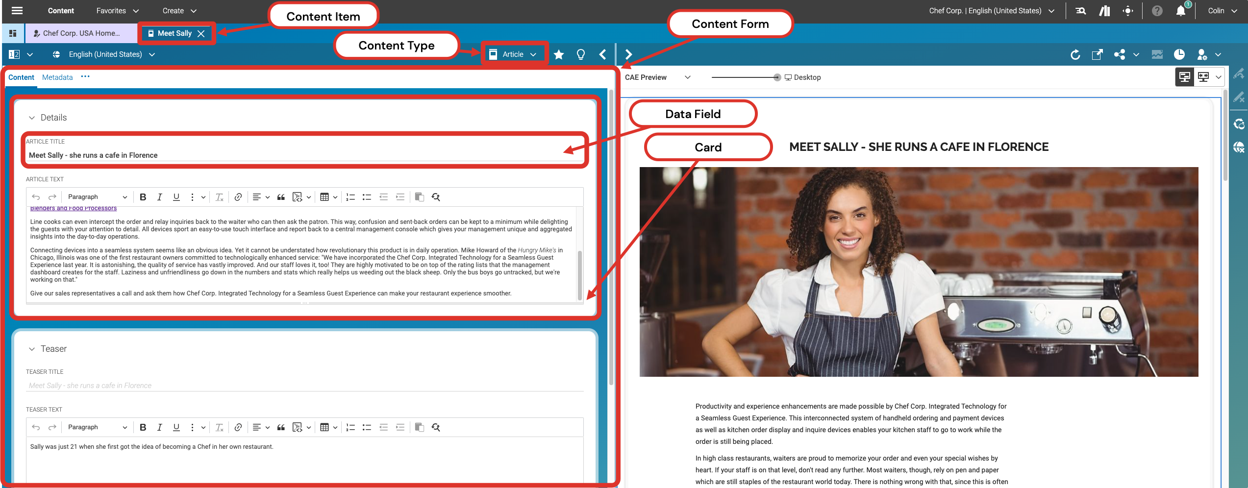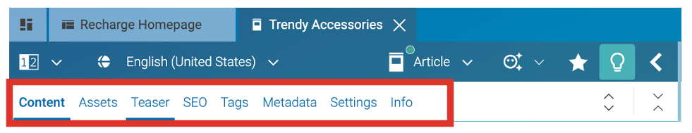 Optimize ordering and grouping of fields on content forms. CoreMedia Studio allows you to group fields on cards and to organize cards across separate tabs. Think about what fields are most often used for each content type. Typically, the most important fields should be directly reachable when opening the content. Less frequently needed fields can perhaps be “hidden” on less visible tabs and cards.