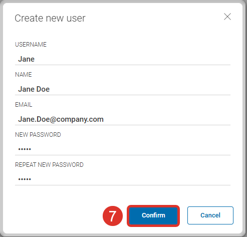 Click the Create a new user button in the Action Bar to open the creation dialog. Fill in the required data and click Confirm (7).
