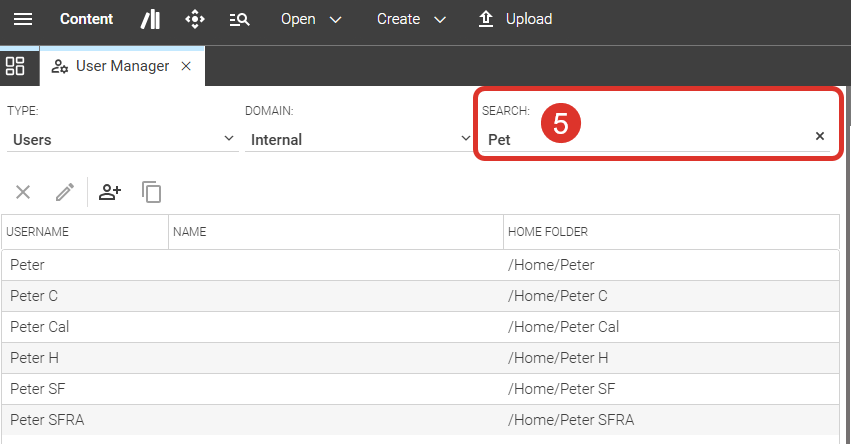 In this example, you are looking for a user named Peter. Type the first three characters, "Pet", in the Search field (5). Results appear immediately — no need to press Enter. Note that the search is case-sensitive. -