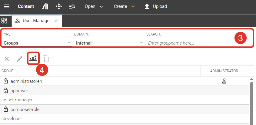 If you don’t need the search option, you can use the Create a new group (4) or Create new user buttons (the latter becomes visible once you switch Type to "Users") to directly create a new user or group. Another way to open the Create a new user dialog is described in step 5.