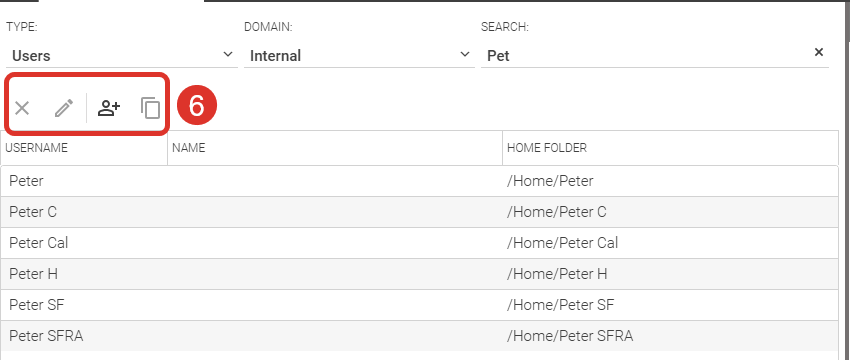 Above the list, you will find the Action Bar (6), which provides four user management actions: delete user, edit user, create a new user, or copy user.