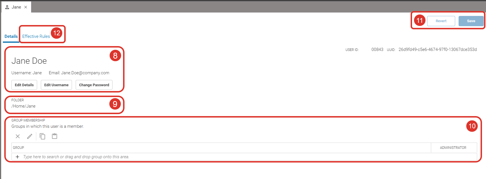 The Effective Rules tab (12) shows the active permissions the user has based on their group memberships. You can view and edit these rules here.