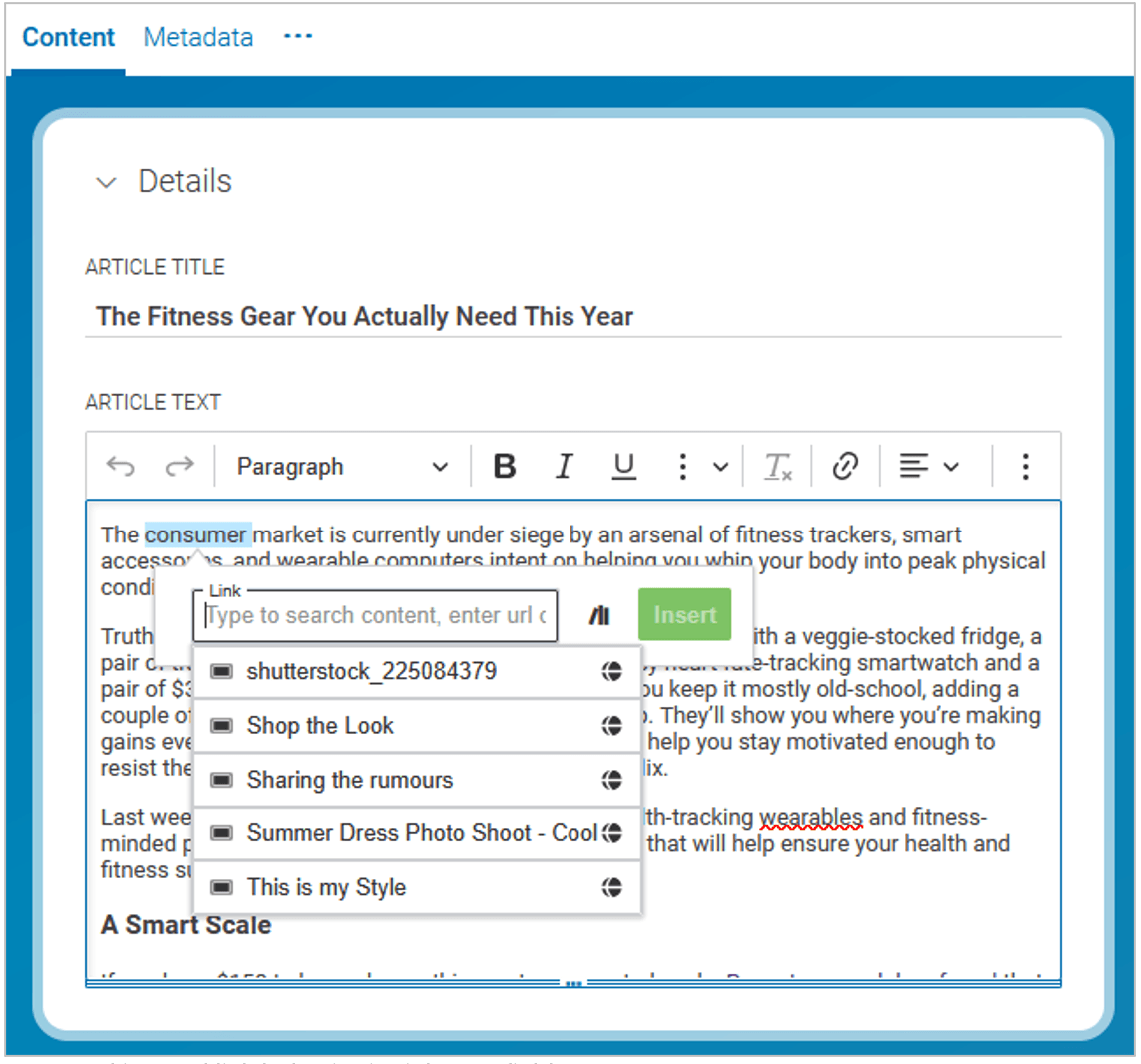 Prior to this release, it was not possible to take Products and Categories directly from integrated Product Catalogs in the Library and add them to link lists on Pages or other Linkable fields. This made it difficult to create augmented commerce-driven pages quickly and efficiently.
