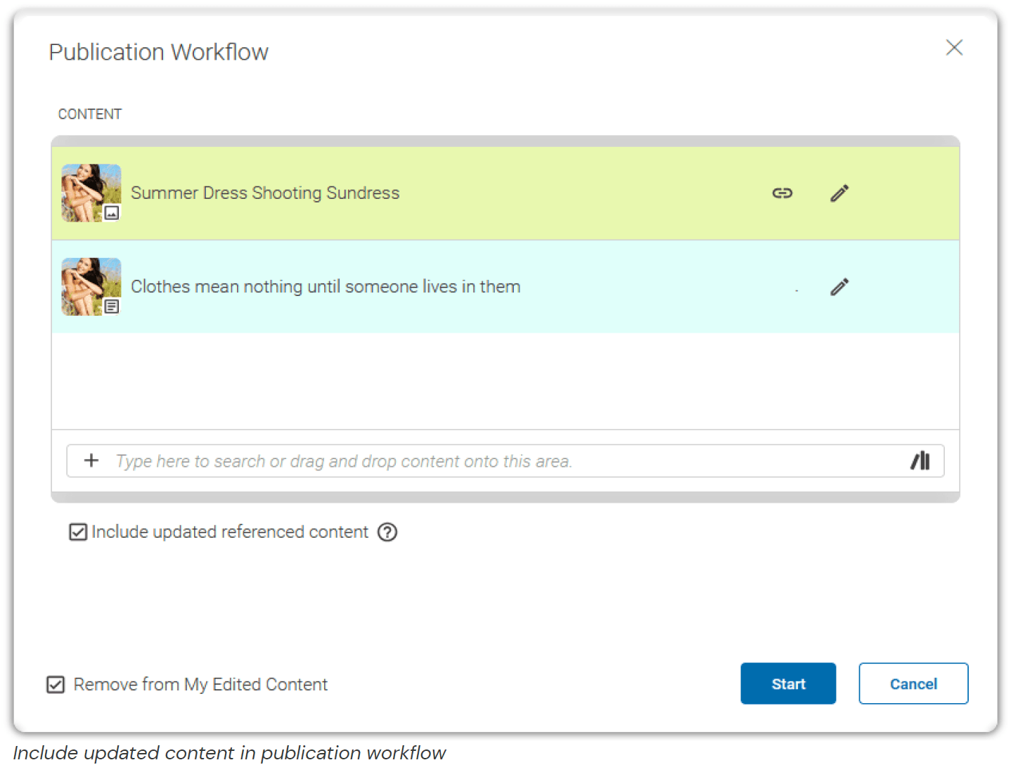 When a publication workflow is triggered for a primary content item, the system can detect whether updated versions of referenced content exist. Editors can choose to include these updated references in the workflow change set so that the primary content and its references are published together.